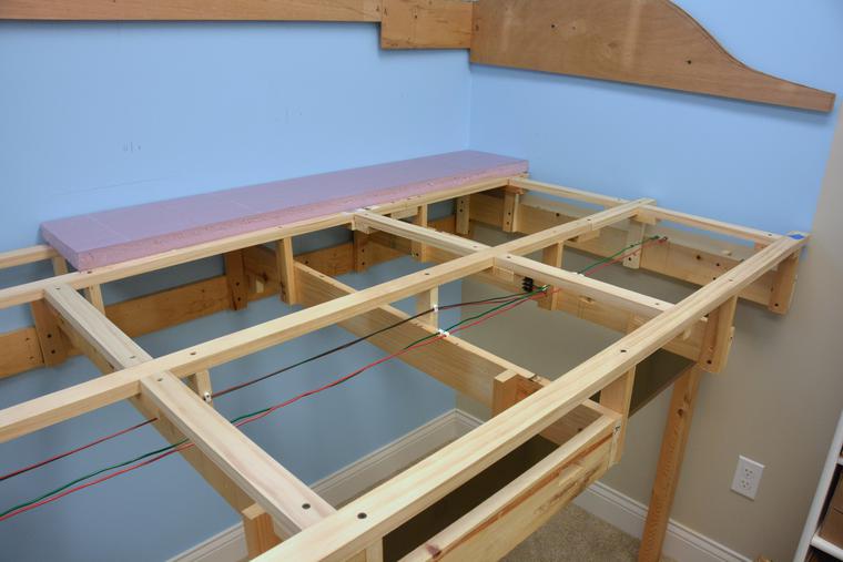 To the left is the benchwork at the Cressmont and Log Camp end of the layout. Notice that the DCC bus and wiring for the 9V structure lighting has been installed prior to the installation of the foam.