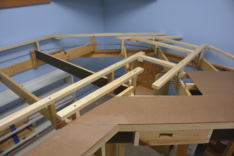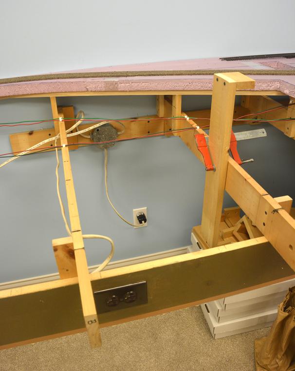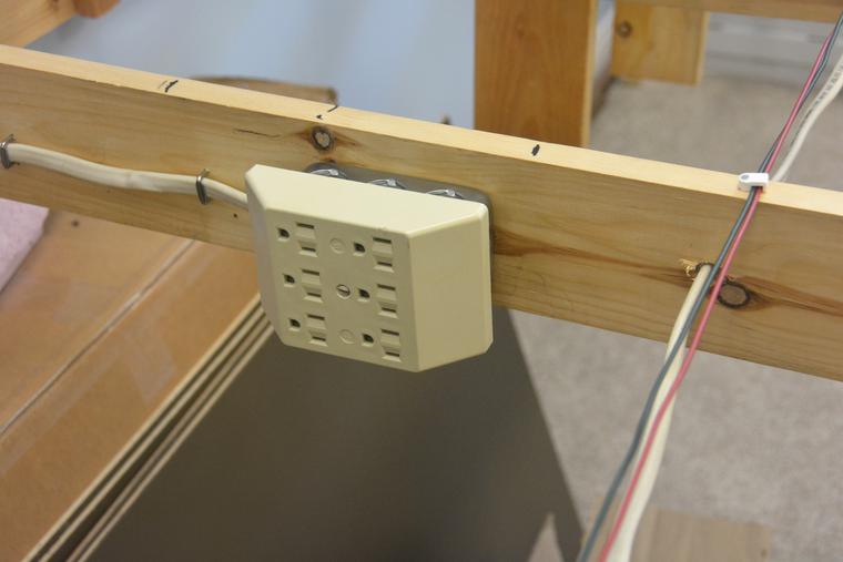 Two power outlets were installed on the front of the layout. They are connected to one of the wall outlets hidden behind the layout with appropriate Romex wire, electrical boxes, etc.)