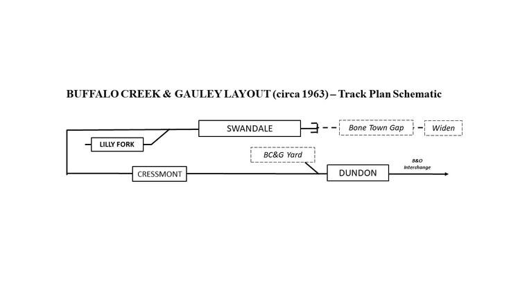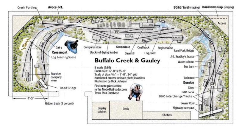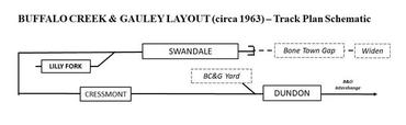 The track plan above, prepared by Kalmbach, illustrates the major elements of the plan. BC&G engines arrive at Dundon from BC&G Yard (staging) and pick up cars from the interchange. Leaving Dundon, the main line crosses the Sand Fork Bridge and then disappears. It emerges at Cressmont where there is short siding. The track disappears again, starts a 3% grade, and emerges near Avoca Junction (the junction with the log branch), crosses over itself and arrives at Swandale. The track continues past Swandale into hidden staging that represents the track to Bone Town Gap and the now unused track to Widen.