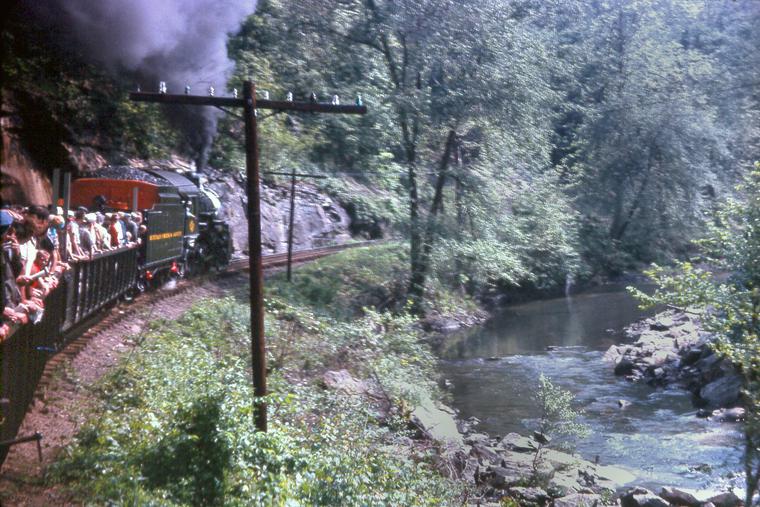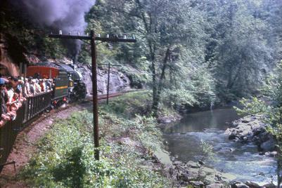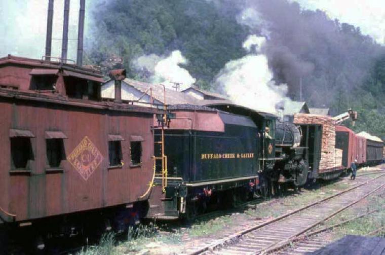 In December 1963, the Rich Run Mine at Widen was closed. After the closing, BC&G trains ran only 9 miles to Swandale where they delivered empty boxcars and flatcars for loading and picked up loaded cars of lumber destined for the B&O interchange at Dundon. Chip hoppers also appeared in the consists as wood chips from the sawmill were now being sold instead of burned. Trains ran just three days per week and were much shorter than in the golden years with 4-6 cars being typical. Because there was no place to turn locomotives at Swandale, BC&G engines ran tender-first back to Dundon.