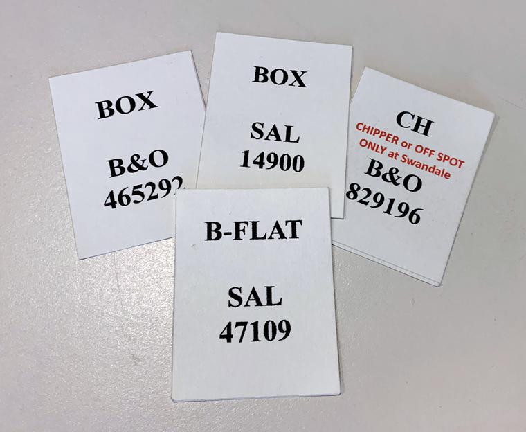 Car routing is done using a simple card system. A card has been prepared for each car. Rather than being placed in a box specific to each spotting location as is typical with car card systems, all the cards for all the cars in each town are in a single box. To make up a train, the 'deck' is shuffled and a specified number of cards are drawn. Similarly for spotting, cards are drawn at random from those in the train for each spotting location. As the cards are drawn, a switch list is prepared. The cards are returned to the box and switching is done using the more prototypically correct switch list. This system generates unique switching patterns with each session. It's easy to swap cars onto and off of the layout as desired and simply swap the corresponding cards.