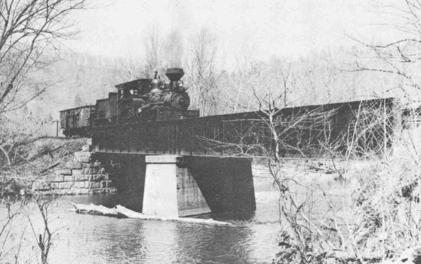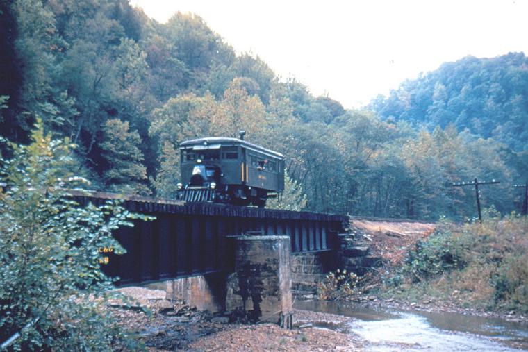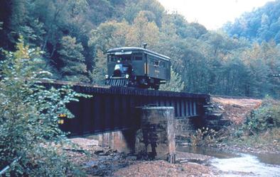 One of the most photographed places on the BC&G was the 142' Sand Fork Bridge. This photo shows how it looked after being rebuilt in the early 1960s with the large concrete center pylon. The full story on the bridge is HERE.