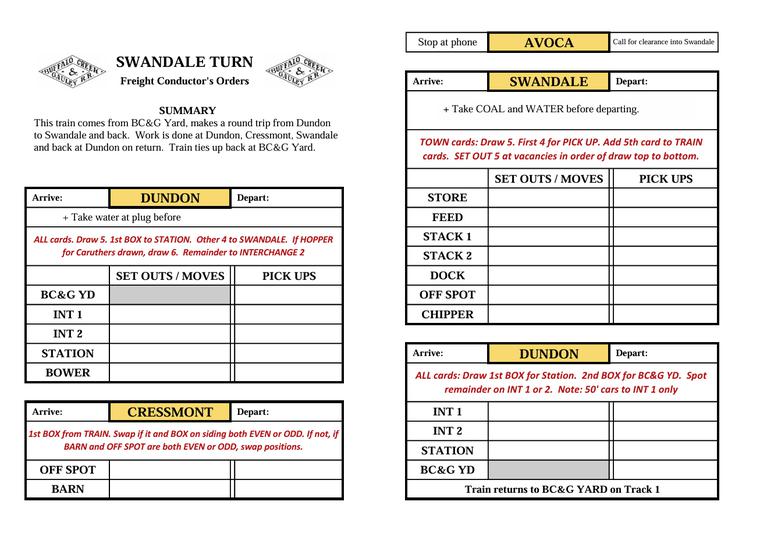 3. BC&G Swandale Mixed – Operates similar to Swandale Turn (above) but with a coach instead of caboose C-1. The consist is limited to 3 cars plus the coach.