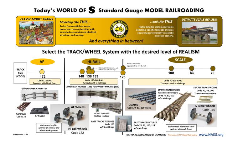 The graphic to the right shows the three approaches to modeling in S and the rail size and wheel profiles associated with each. My layout is hi-rail by the NASG's nomenclature.