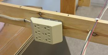 This multiple-outlet box was connected to a wall outlet that is on a wall switch at the door to the layout room. All of the DCC and lighting systems will be connected to this group of outlets so that the entire layout can be powered on and off from the switch at the door. Notice that the Romex is held securely with either staples or by passing through holes in the benchwork. The red and green wires on the right are the buses for the 9V circuit for structure lighting. Small plastic 'clips' hold the wires in place on top of the rafters.