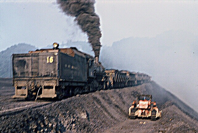 In the two undated photos below by an unknown photography shows the same engine on what appears to be a clearer day. Below left the engine is leaving with the cars in tow. Presumably the photo below right is near the wye after the engine has run around the cars in preparation for pushing the string out onto the gob pile.
