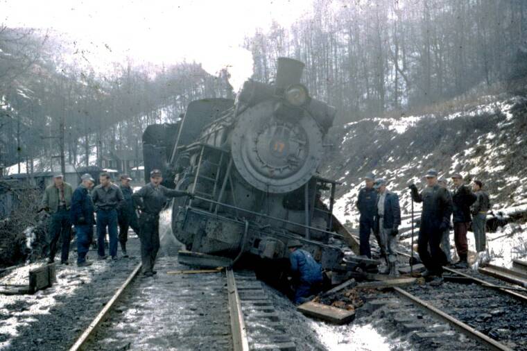 This photo from Theodore Griffith was taken during the winter of 1957-58. The location of this mishap was just behind the WIden Bank. I'd guess it took a while to get #17 back on the rails! Is the guy with his hand on the locomotive the only thing keeping it from going all the way over?!