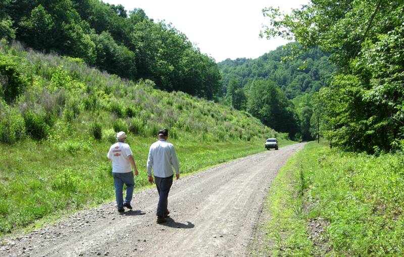 This photo shows how the foot of the gob pile appears in 2007, after reclaimation efforts. From the best of my ability to discern, the photo was taken from about the location of the BC&G engine in the Emerick photo. The BC&G track is buried under the earth that was brought in to cover the gob. It emerges from under the earth a ways beyond where the road curves out of view in the distance.
