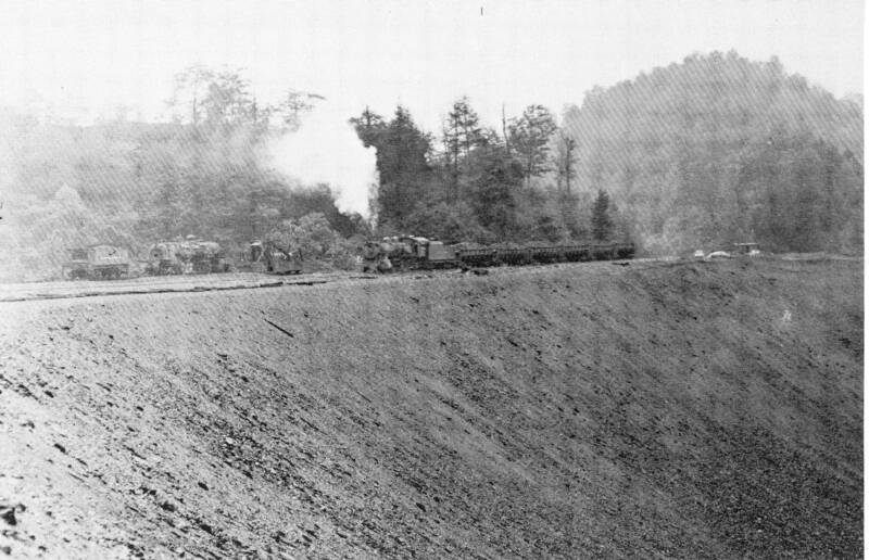 Again according to Ovalee, gob trains departed the tipple about every hour, or as fast as they returned from the gob pile. Assuming a six car train headed out every hour, 45-50 cars of gob were loaded in an 8-hour shift. On the west pile, both the wye and the switchback (see map above) were used to get the train in the desired configuration for going out on the gob pile and returning to the tipple.