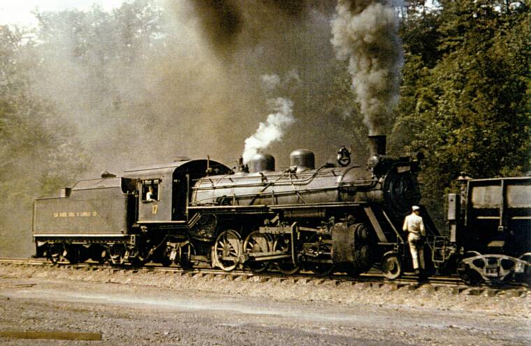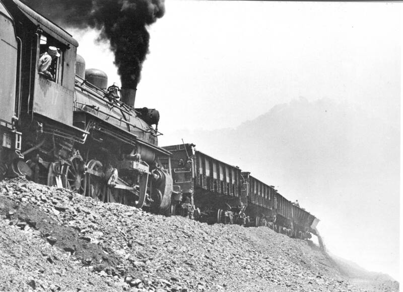 This wonderful photo was provided by Roger Johnson. It is unique in a couple of ways. First, it clearly shows a Clark car in the dump position, perhaps the best photo of this that has surfaced to date. Second, it is a beautiful view of engine #10, the Mikado of which we seem to have the fewest in-service photos.