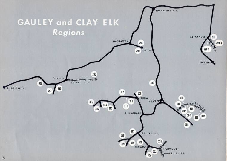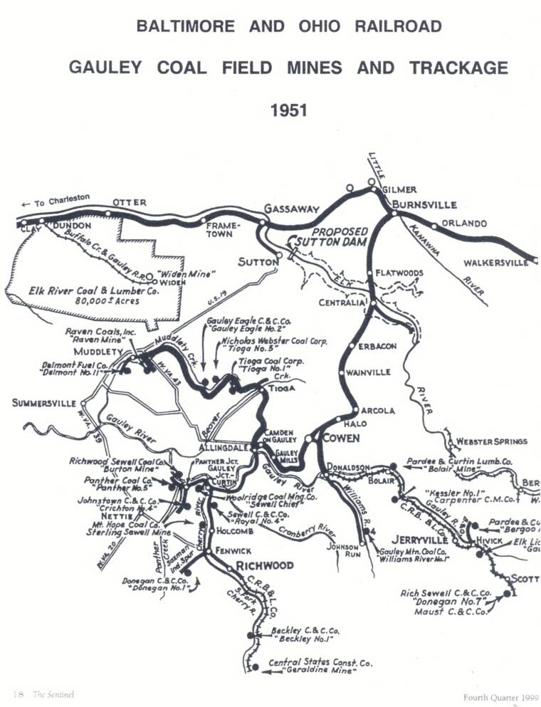 This map is similar to the one above in that it was also prepared by the B&O. It is slightly earlier, 1951 versus 1957, and it shows the area in more detail. It is the area that the B&O referred to as the "GAULEY COAL FIELD". This map was published in the Fourth Quarter 1999 edition of the B&O Historical Society magazine "SENTINEL" as part of an article on the B&O's central West VIrginia coal field operations. Notice that the area of the ERC&L is outlined in the upper left of the map and the BC&G is shown as well.