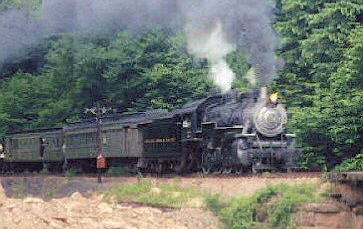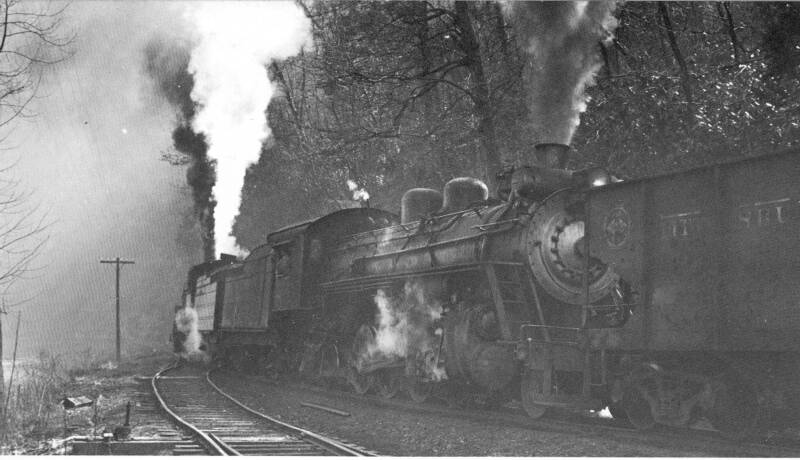 At Avoca where the Lilly Fork logging branch headed off into the woods there was a wye. Upon arriving at Avoca on the return trip, the coal train executed a move that's fun to duplicate on a layout. The engine was cut off from the train and turned on the wye. This move got the engine facing the right way for the next day's run. The train then proceeded past the Dundon Yard and to the B&O interchange tender- first and set out the loads on the interchange track. It would then return to the Dundon yard with the caboose and any cars that might be destined for the yard.
