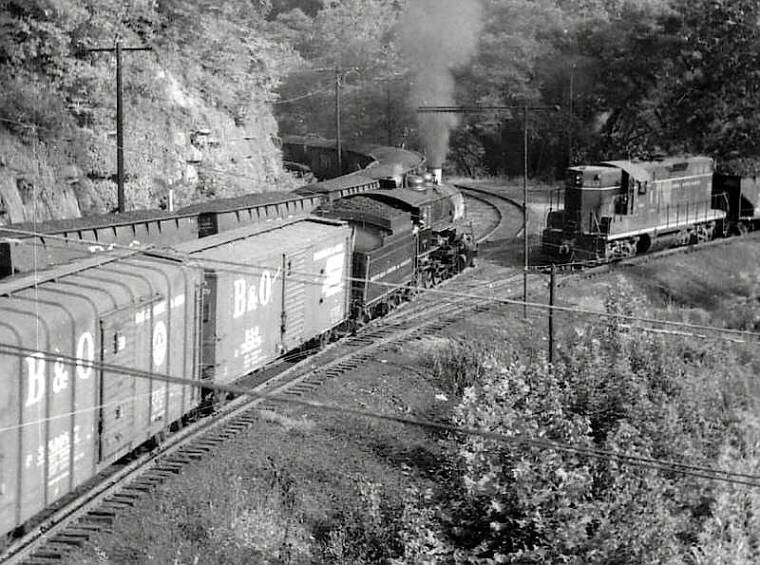 It was the B&O Grafton Local that served the interchange. It operated on the 187 mile B&O line between Grafton and Charleston. It dropped off and picked up hoppers for mines all along its route. In the wonderful color photo by Bill Price below, a B&O Q4 #4557 is handling the interchange duties. Some photos show the BC&G engine at the interchange at the same time as the B&O engine. In more recent years the B&O engine was one, and sometimes a pair, of GP9's (photo below right).