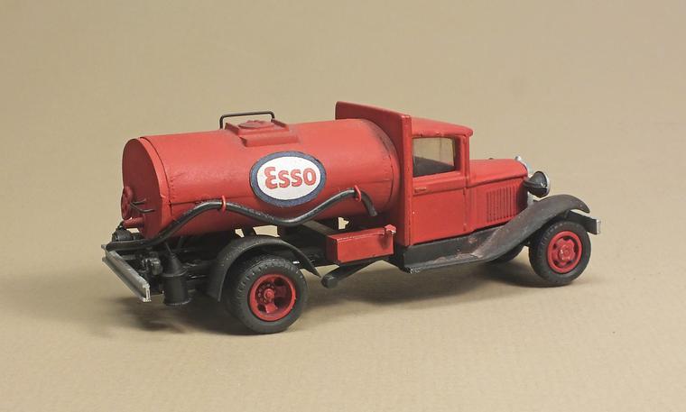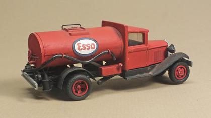 This free-lanced 1932 Ford gasoline truck started as a Matchbox panel truck. The vehicle was cut off at the rear of the cab and a new frame was fabricated from styrene. The tank is a plastic item from the scrap box, like the small fuel tank mounted behind the cab. The source of the wheels and tires is lost to history. The hose is a piece of wire. .020" brass wire was used to make the grabs. On the right is the