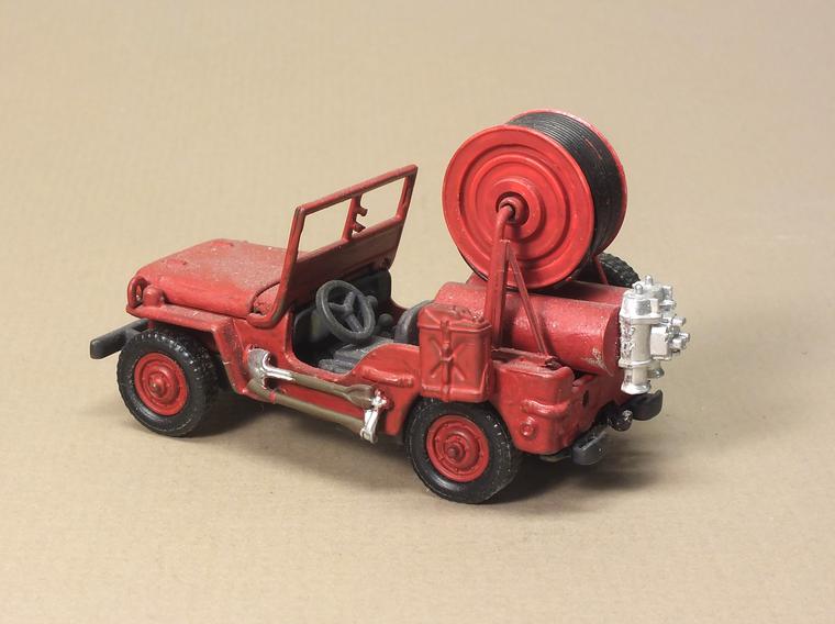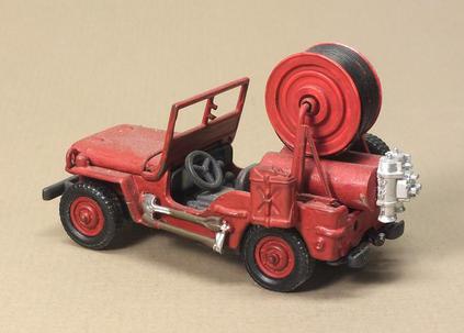 The manufacturer of the 1/64 Jeep isn't known. The hose reel and tanks were scratchbuilt. The hose is wire. Car modelers might recognize the silver 'pump' on the back as Weber side-draft carburetors from a 1/25 kit! Pastel chalks were used to lightly weather the finished vehicle.