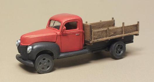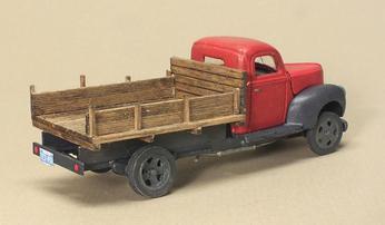 I could not find a 1/64 model of a '41 Dodge but decided that a '40 Ford was 'close enough'. The cab was cut from a '40 Ford pickup, the chassis was made for styrene, the wheels and tires were from my scrap box and the bed was built from basswood strip wood. The license plate was made on my computer. The vehicle was lightly weathered with pastel chalk.