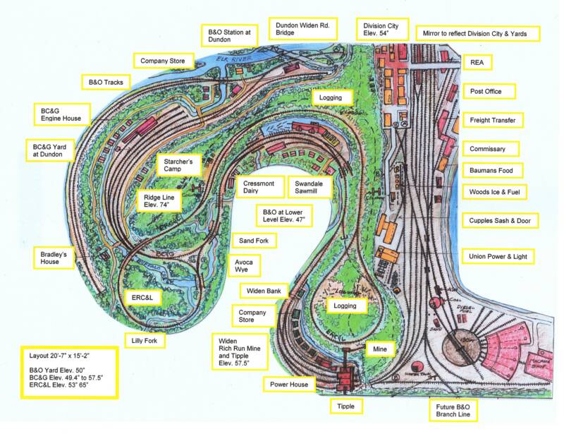 The B&O starts and ends at Division City. It passes by Dundon and the Elk River, enters a tunnel and continues on a lower level below the BC&G, reemerging through tunnels into Division City. Its plan is a simple "L" shaped oval with passing sidings and two reversing loops. The B&O is planned to expand into another room where Kanawha City, with an industrial switching area, and Strange Creek, with another coal mine and a paper mill, will be located. Also, a wye is planned for the B&O tracks below Widen that will lead to B&O staging tracks.