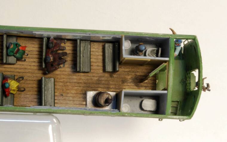 Coach #17 - Phil completely scratchbuilt this model of BC&G #17 using PRR drawings found here. The model has a removeable roof and a completly detailed interior, including a crewman in the restroom (below)!