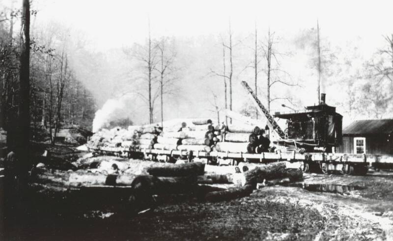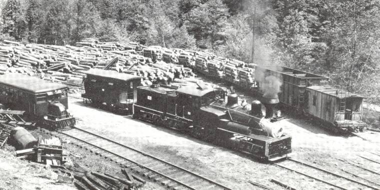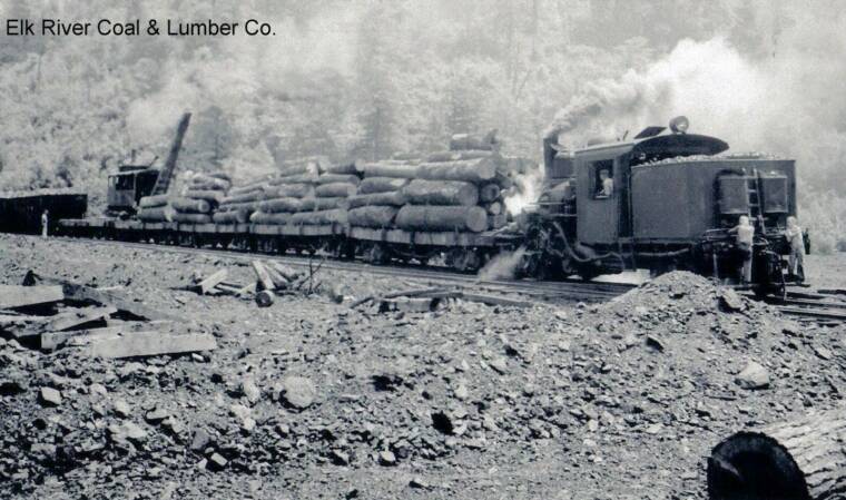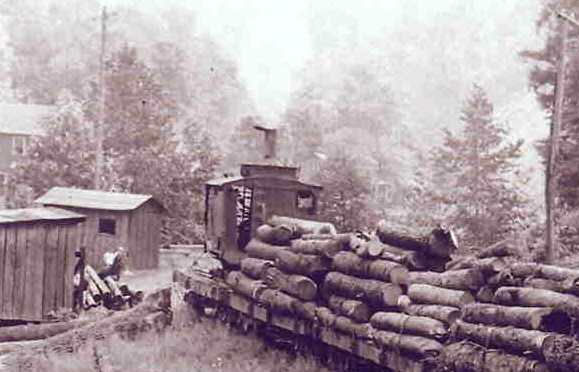 This is a rare photo of the American log loader in its orginal steam-powered configuration. The boom and overall size certainly would support this is the ERC&L loader in its early years. The photo is from Doug Andre's collection. Doug points out that the flat cars are riding on Fox trucks.