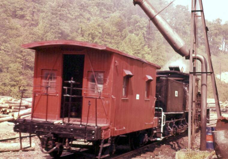 The caboose had three owners in pretty short succession. Soon after the ERC&L sold the logging activity to W.M. Ritter, that company was absorbed by Georgia Pacific. The John Phillips photo from June 1963 shows the caboose, freshly painted, sporting its new GP logo.