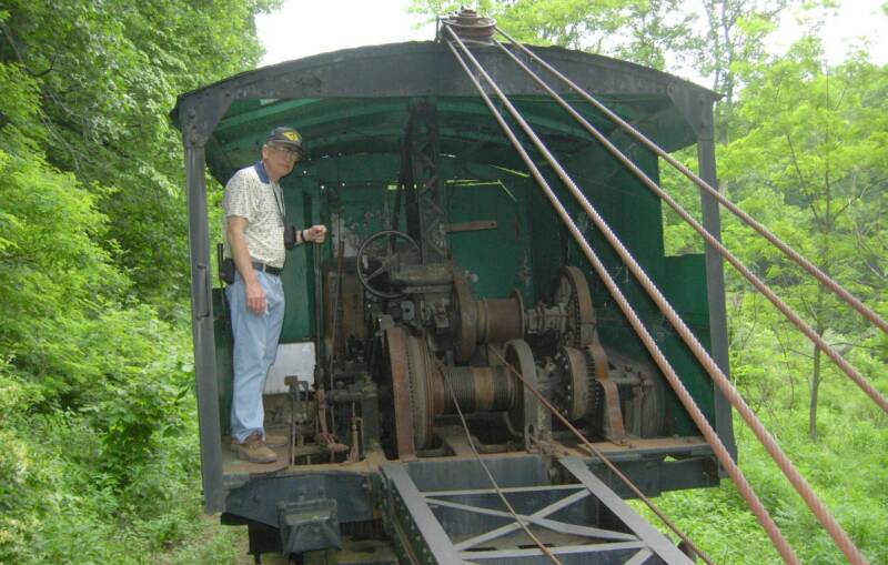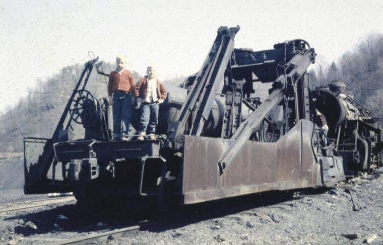 This photo, taken in the winter of 1959 on the Widen gob pile, was provided by Theodore Griffith. Theodore, his brother Mark, and his son Mathew have done some research on the piece of equipment and believe it to be a Jordon Rail Slag Spreader built between 1917 and 1921. Further, they believe it was originally built to spread slag and ballast for Pennsylvania steel mills. It apparently was used by the ERC&L to spread gob at the Widen pile. Theodore indicates the locals always referred to it as the 'gob spreader'. The large tank in the center of the machine stored compressed air (provided from the locomotive) which was used to swing out the 'wings' of the spreader (shown here folded back). These arms spread and leveled the gob dumped from the Clark side-dump gondolas. Theodore suspects that the engine behind the spreader is #15, the same engine shown on page 73 of the Warden book. Notice that the engine is derelict and without cab or stack.