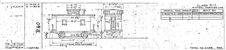 Ed Kirstatter has provided this drawing of the B&O K-1 series of cabooses. Notice that the cabooses originally were equipped with cupolas. According to the note in the lower right of this drawing there were 900 of these K-1 class units.