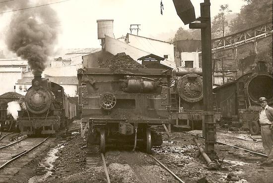 These two photos, from the collection of Loretta Johnson Samples include images of the American loader when it was steam powered. The location is not known but the ground litter suggests they might have been taken near the same location. In both photos there are hoppers visible in the background. Perhaps these photos are of the same train. There are indications that logging was done beyond the Widen mine at one time. Cody Burdette has reported that the stack on the steam-powered loader was hinged and had to be lowered in order to pass under the tipple. Perhaps these photos were taken near the mine or the gob pile. Date unknown.
