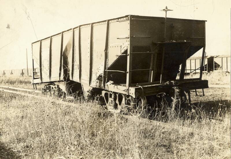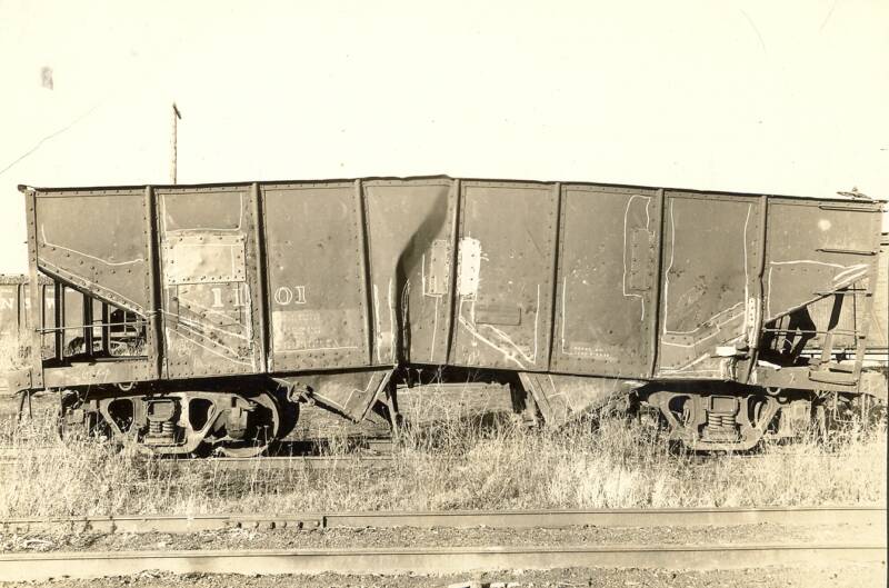 The lettering on the hopper in the center of the photo cannot be read even when enlarged so it cannot be confirmed whether this is an early wooden BC&G hopper or not. It does not have the end construction of the steel BC&G hoppers (see below).