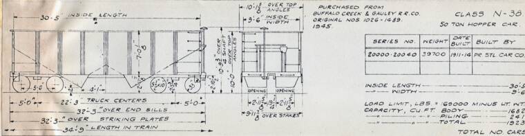 B&O historian Ed Kirstatter has provided this drawing from a B&O roster book. It shows the dimensions of the first series of BC&G hoppers. They were sold to the B&O in 1945 as indicated in the notes at the top center of the drawing. These cars became B&O class N-38 and were numbered 20000-20040 indicating that only 41 of the original 600 cars went to the B&O. Per the note on the drawing the lowest numbered car that went to the B&O was 1026 and the highest numbered was 1482. The disposition of the remaining cars is unclear.
