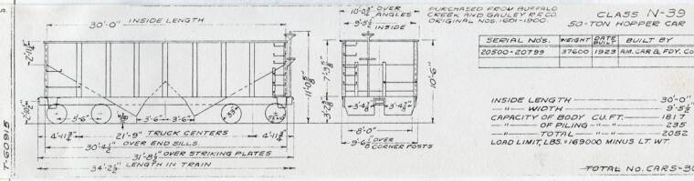 The BC&G's second order of hoppers was built in 1929. An additional three hundred (300) cars were ordered numbered 1601-1900. These cars were just slightly larger in terms of interior volume even though they were slightly shorter over the striker plate.