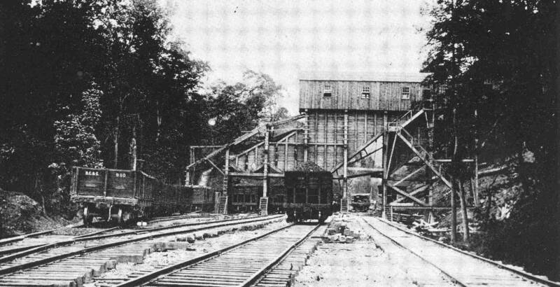 Very little documentation of rolling stock is available for the very earliest years. According to the Warden book, "intially the road was operated with wooden hoppers and gondolas". this comment is substantiated by the photo to the right which clearly shows wooden gondolas lettered BC&G on the left. Click on the photo to enlarge.