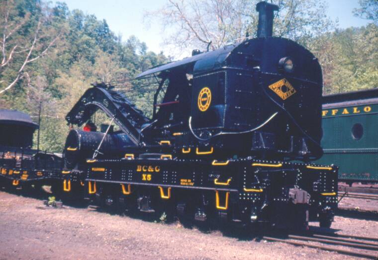 This photo was taken by Bob Amon in May of 1963. It is a relatively rare color photo of X-5. Obviously, the crane has a fresh coat of paint, no doubt in preparation for a railfan weekend. The passenger car in the background also appears freshly painted as does the tender flat coupled to the crane.