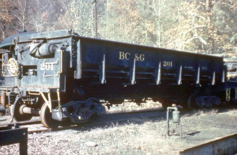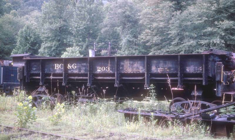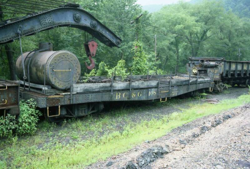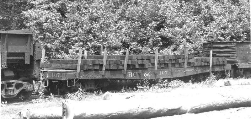 Tony Reagle has indicated that in THE LOG TRAIN (Issue 53) entitled "Cass Scenic Railroad All-Time Roster" by Phil Bagdon there is reference to a steel gondola acquired from the BC&G. The only gondola listed was ex-C&O No. 29264 (originally Hocking Valley) that "operated as a work train car on the BC&G in its C&O lettering". It was donated by Pittston Coal Co. in 1970 and scrapped in 1973. This gondola may be the one visible on the right side of the David Marquis photo of flat car #107 above.