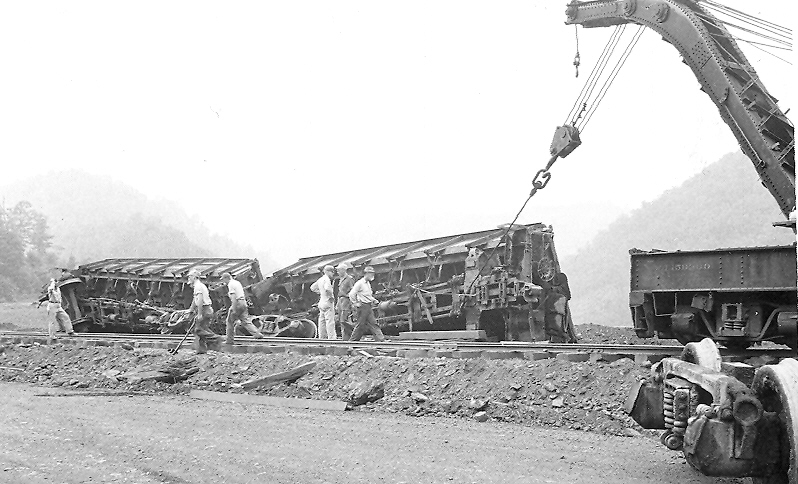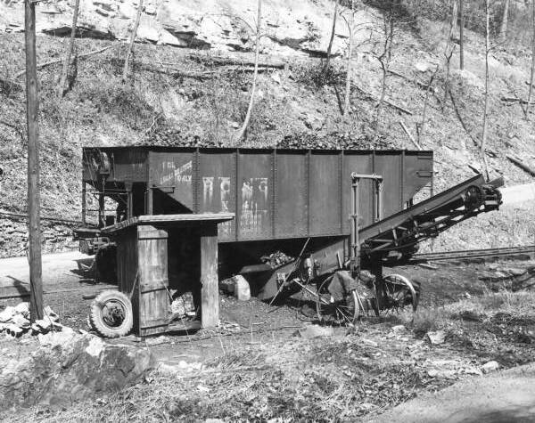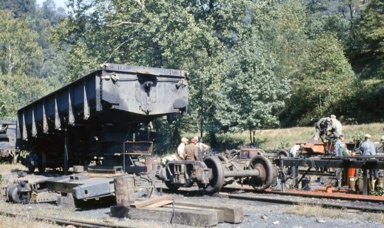 Below are two photos of the X-6 at work. The left photo was taken on or near the gob pile. The right photo is at Dundon yard. That's Clark side-dump hopper #807 being worked on in the photo below. The photo is dated April 3, 1958 and so the fact that this car is not in the 1957 Registry listing is curious.