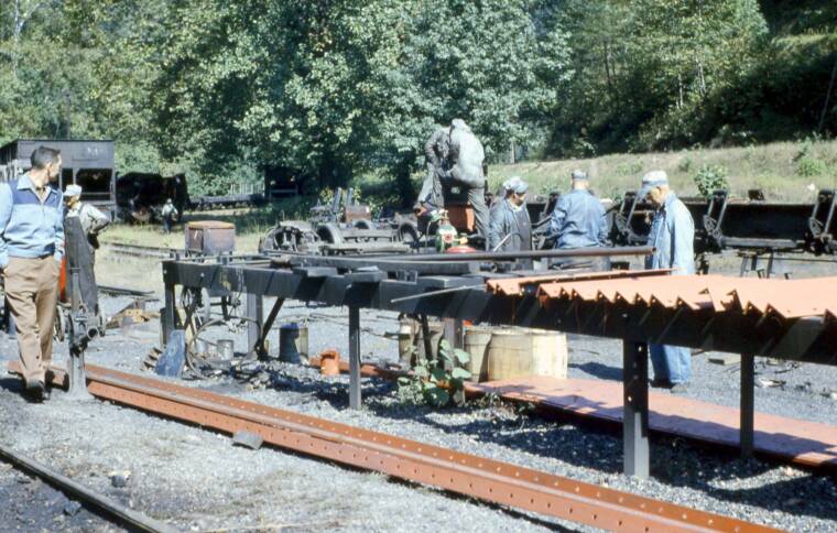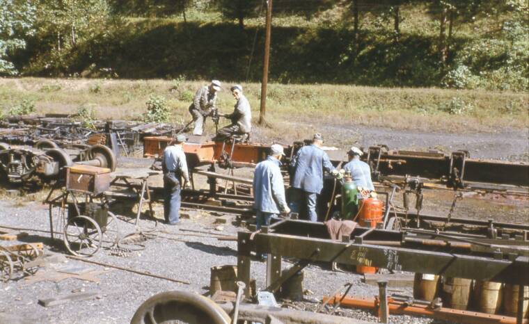 Here are three of the most unusual BC&G photos that one might ever find! First of all, it takes a real railfan to even realize the significance of event. Taken by John Phillips in October 1958, they show the BC&G shop crews rebuilding Clark gons, presumably to go into MOW service on the BC&G. Based on how far disassembled the cars are, the rebuilds were very complete.
