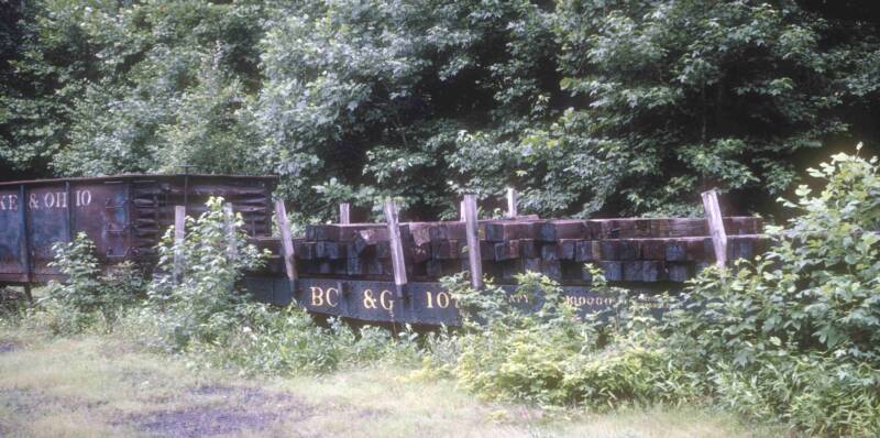 According to the Equipment Registry, the BC&G had three all-steel gondolas during the 1945 to 1957 period. My search, however, has not uncovered any confirmed photos of these cars. A steel gondolas is just visible in the color photo of wood gondola #116 above as well as in the black and white Ameling photo of flat #107 above. The steel gondola in the 1963 color photo by Marquis of flat #107 above appears to be lettered for the Chesapeake & Ohio, although this might be one of the cars listed in the registry.