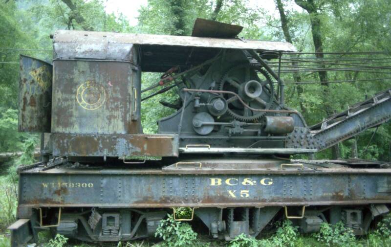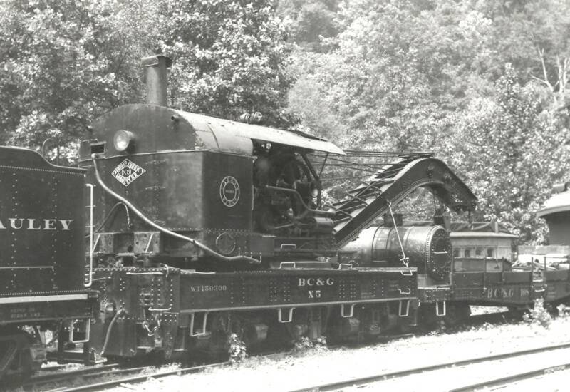 The most impressive piece of hardware on the BC&G roster of MOW equipment was Industrial Works ex-Seaboard Airline's 60-ton wreck crane X-5 built by Industrial Work (Bay City, MI) in 1907 (c/n #1847). Note: the capacity has generally been reported as 150-tons.) It was painted black with yellow lettering and steps in the late 1950's. I have found no information about when the BC&G acquired the crane although I have a boiler inspection for it dated 1952.