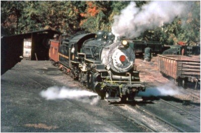 The photo above was offered for sale on Ebay. The date and photographer are unknown, but there is a steel gondola clearly visible. While the lettering is not readable, there seems to be lettering high along the sides, not unlike the location of the C&O lettering on gon in the Marquis photo above although the car is much more heavily weathered here. This car also appears to be similar to one in the photo on page 42 of the Warden book showing the Shay pulling a gon in MOW service. The loco has a diamond logo so the date is probably 1962 or later.