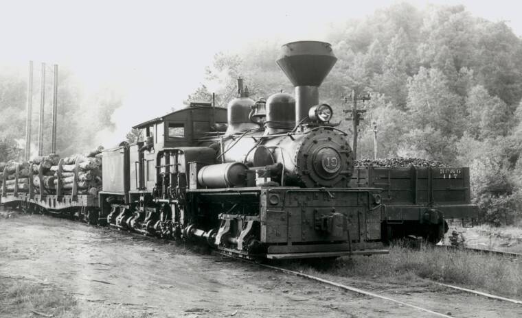 Cody Burdette, former ERC&L hostler and son of ERC&L engineer Theodore Burdette, observed that this photo is a bit unusual in that the #19 has the 3-chime Crosby whistle mounted that was normally on one of the BC&G engines! Cody is an expert on steam whistles and has a large collection of these unique pieces of history. Cody further indicates that the gondola #117 is filled with coal that is probably scheduled to head out on Lilly Fork the next morning. Coal was used in stoves at Starcher, required for Climax #3 and was also distributed to residents who lived along the logging branch.