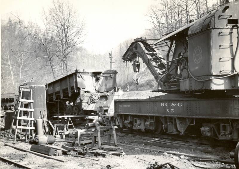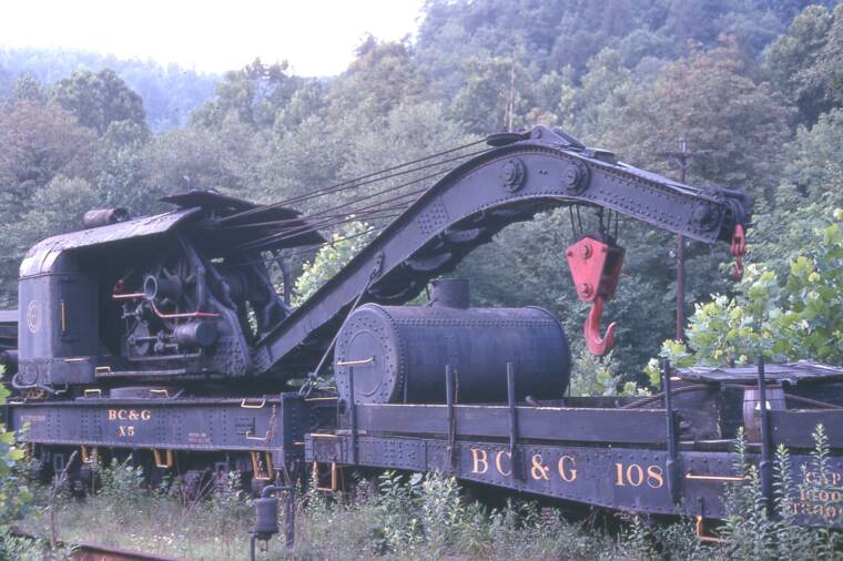 Richard Bradley captured these two images of crane X-5 during a visit to the BC&G in July of 1969. The crane looks in pretty good shape considering that the railroad had been closed for four years by this time.