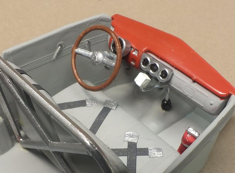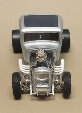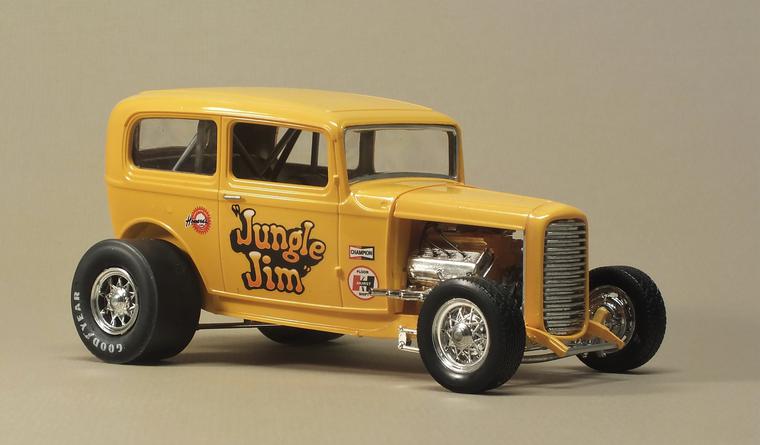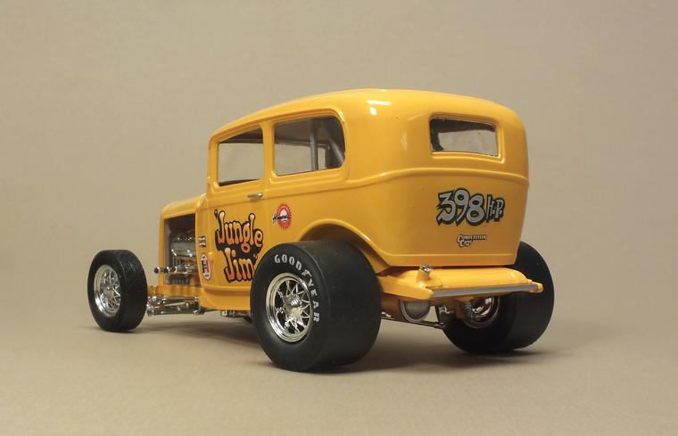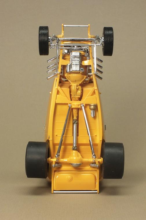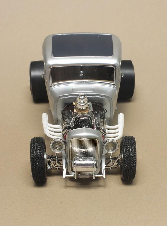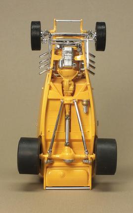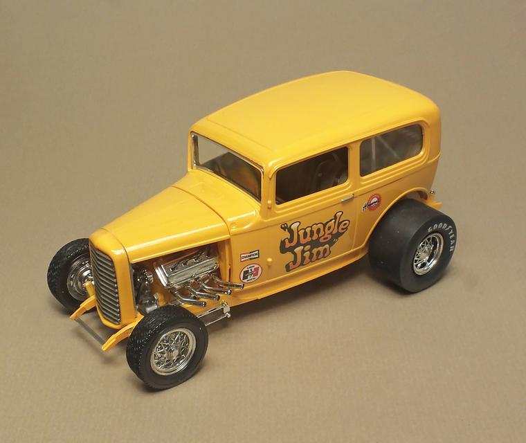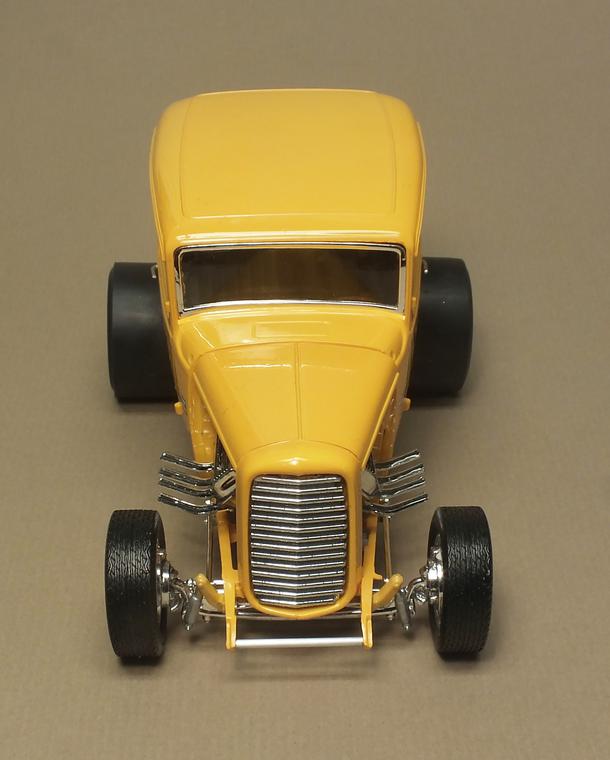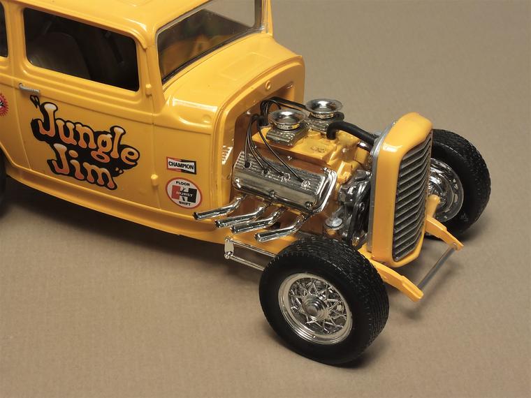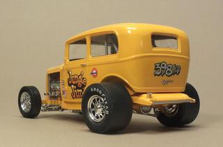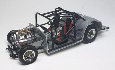 There was a fair amount of parts swapping to build this car from a Revell 32 Ford Sedan kit. The wire wheels came in the kit but they were modified to accommodate the giant rear tires. The engine came from eBay and looks pretty cool stuffed in the narrow engine compartment. The roll cage structure was scratchbuilt from styrene rod. The headers and grille are from other kits, too. The frame spreaders front and rear are 1/8" aluminum tubing. The paint is Tamiya Camel Yellow.