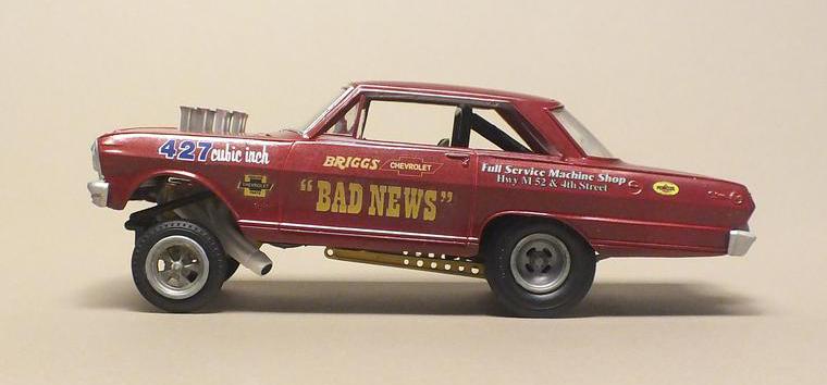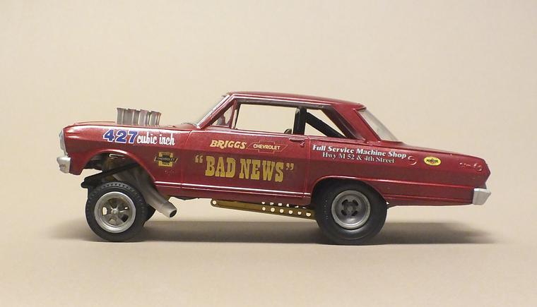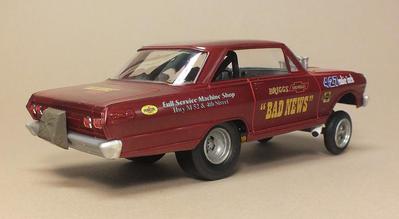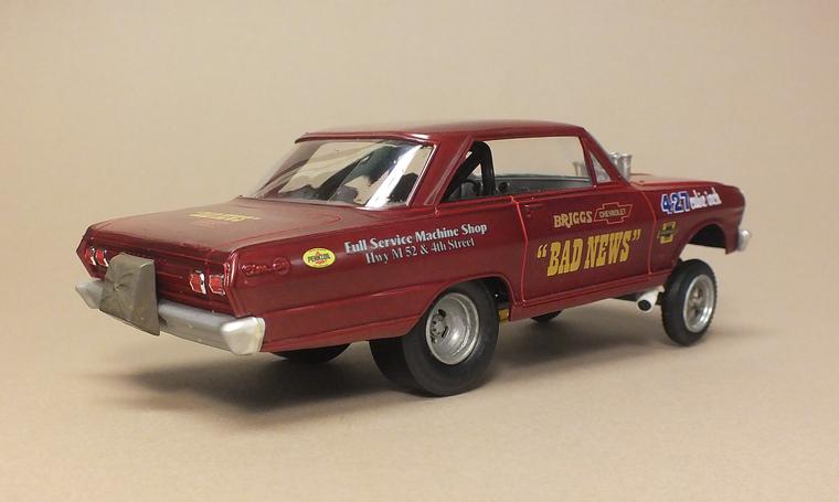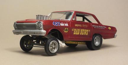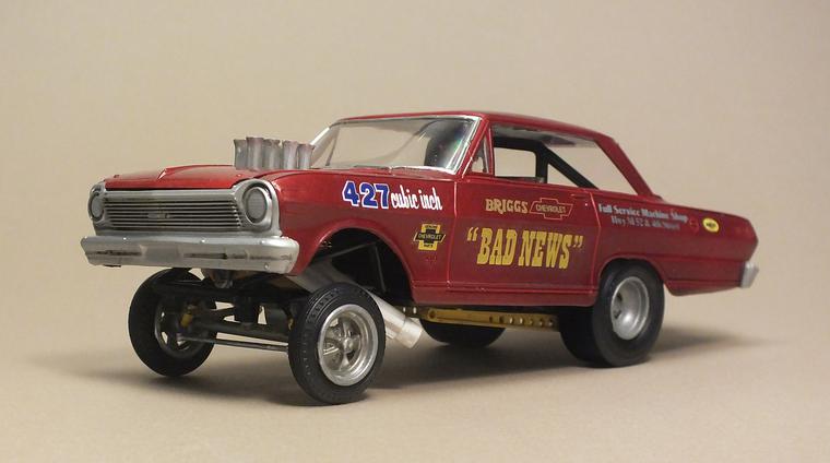Drag racers are an inventive bunch. No different than those in other forms of motor sport, I suppose. One of the strangest trends in drag racing was the so-called Factory Experimental (F/X) 'altered wheelbase' stock cars of the 1960s. The rear wheels were moved forward to improve weight transfer and therefore traction. The alterations were done on many models of cars both large and small. A fraternity brother of mine had a Chevy II Super Sport fitted with a 327 V8. The drag guys took it one step further by stuffing a 427 into the little cars to create a strange looking but fast running dragster. This model was built from an AMT kit with a few components, including the rear wheels and decals, from other kits.