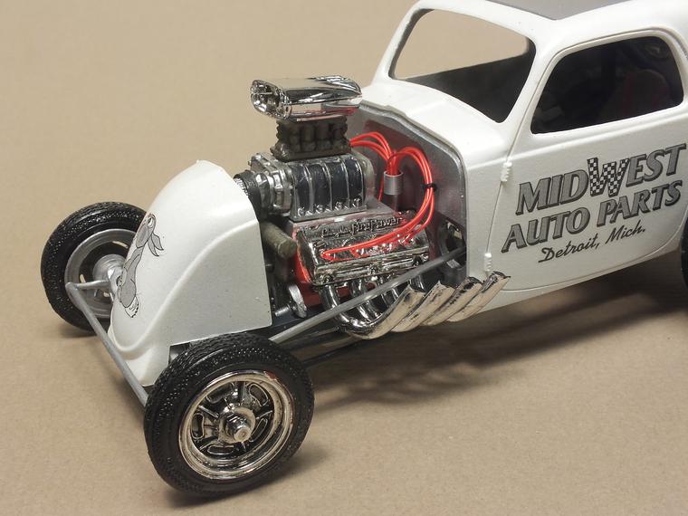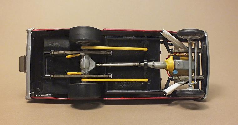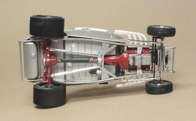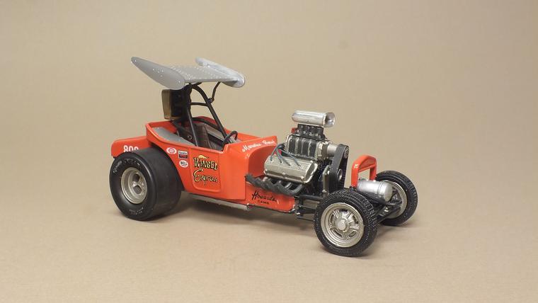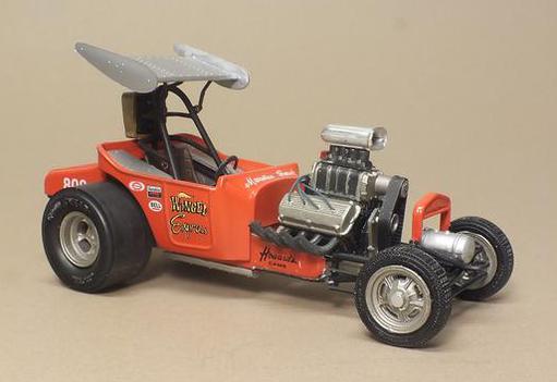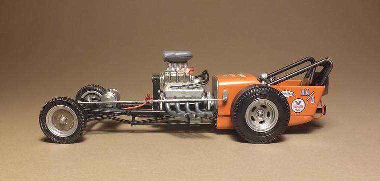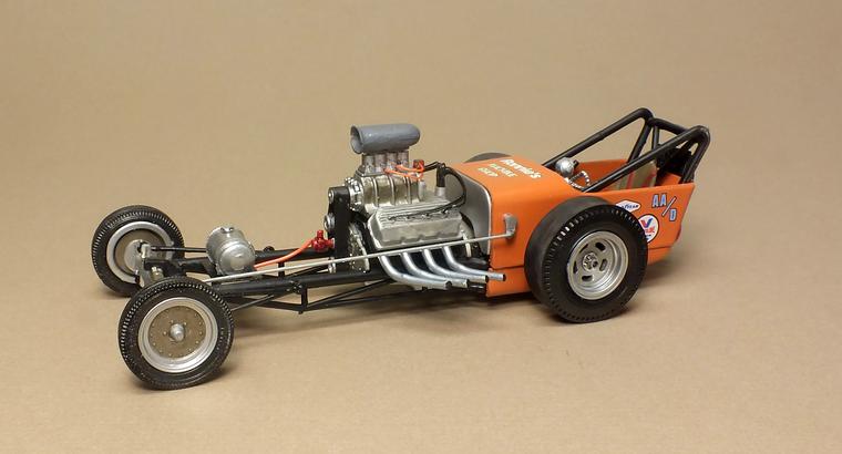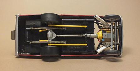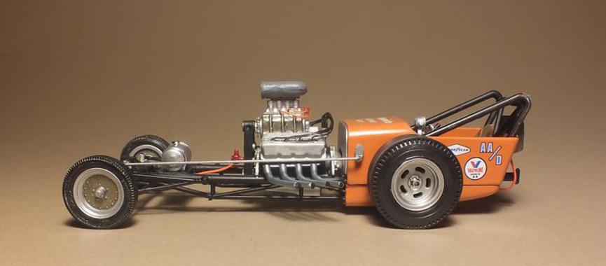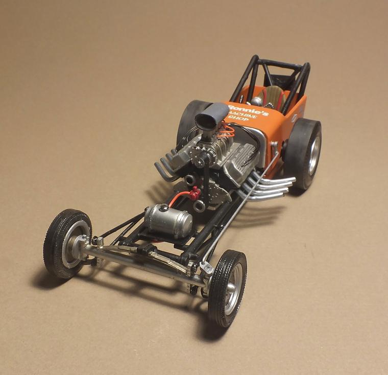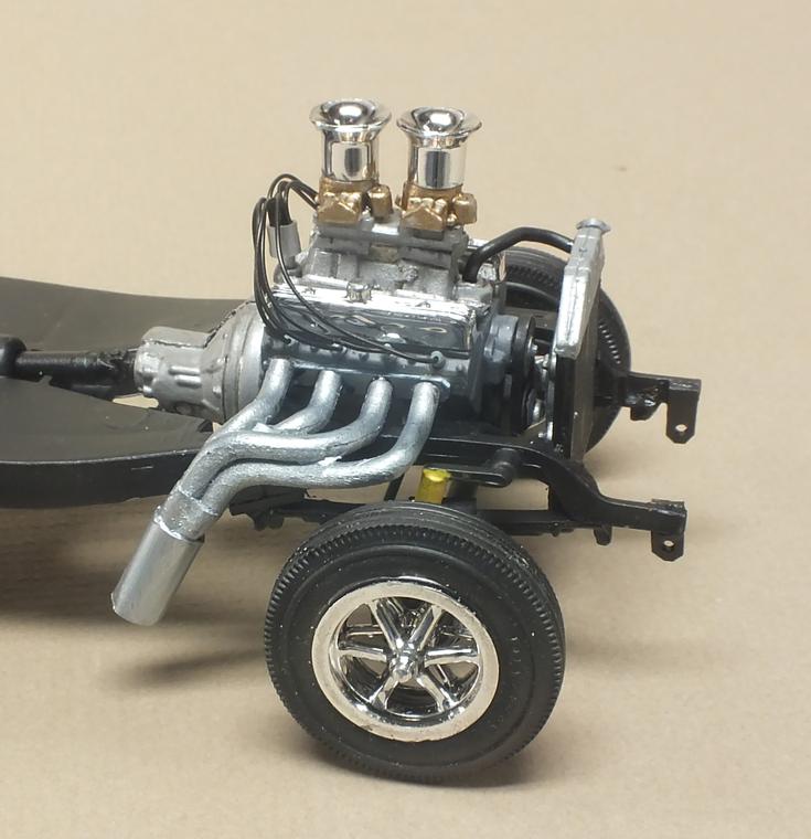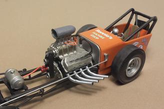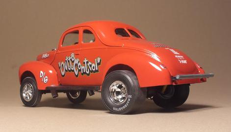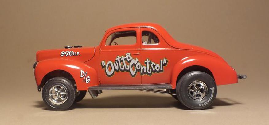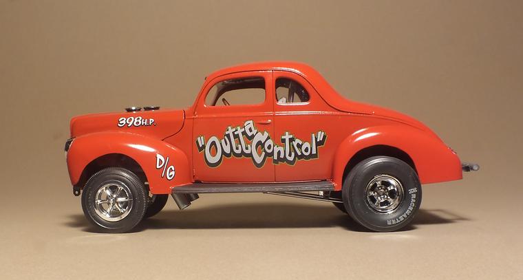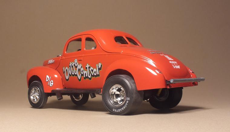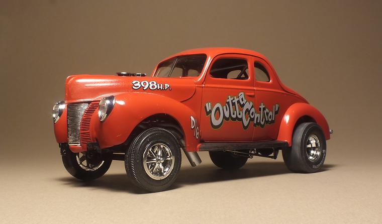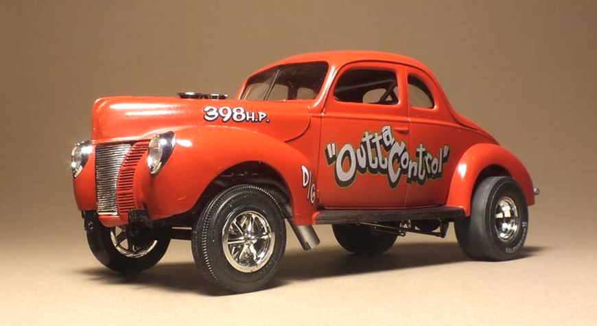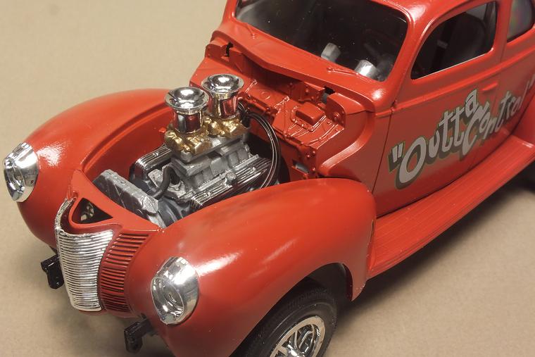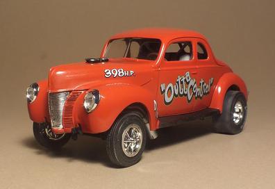 Starting with a kit of a stock '40 Ford, it was necessary to build the straight front axle from aluminum tube and brass wire and replace the stock rear axle/transverse spring with a larger axle and longitudinal springs from a pickup truck. The wheels, tires, carbs, velocity stacks, manifold, shocks, traction bars and decals are from other kits while the headers and wired distributor are commercially available items. The car was painted with Rustoleum Paprika semi-gloss spray paint.