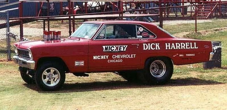 While not as common as the Willys bodied cars, 1940 Ford coupes were used to build gassers, too. This one is powered by Oldmobile and takes fuel through dual quads mounted on a hi-rise manifold. A straight front axle, headers dumping into the wheels wheels, large slicks and an aggressive stance are all the elements that define this purely American racing formula.