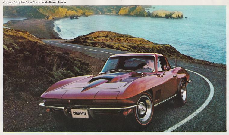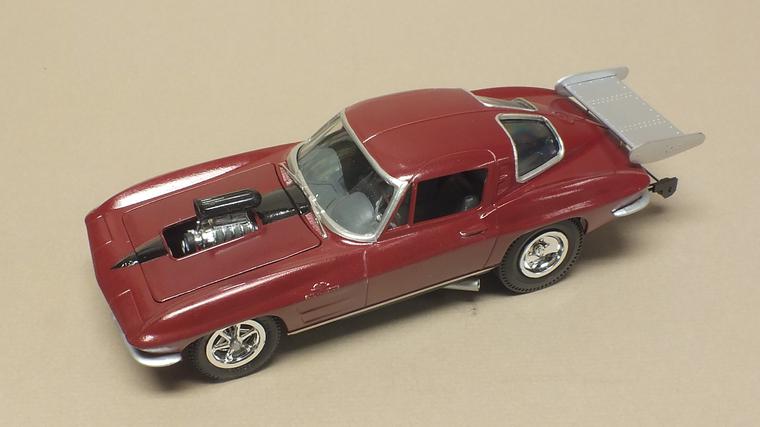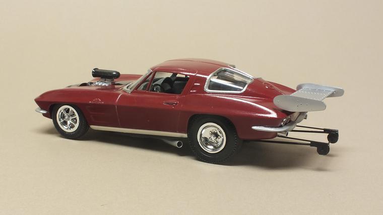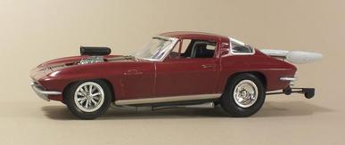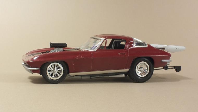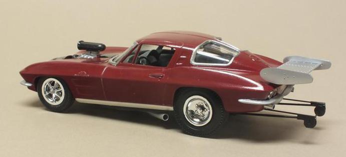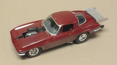 When I purchased a new 1968 Firebird, I really wanted to own a Marlboro Maroon 1967 Corvette Coupe. I still have the brochure (left) that caused the stir! Well, I never bought the 'Vette but I still think the car is a classic. Since I likely won't ever own one, I built this 'show and go' drag race version from an 1963 AMT kit. I've conceived the model as a streetable drag car...one that "looks wilder than it is". It has a full interior, street exhaust and a license plate!