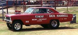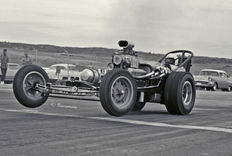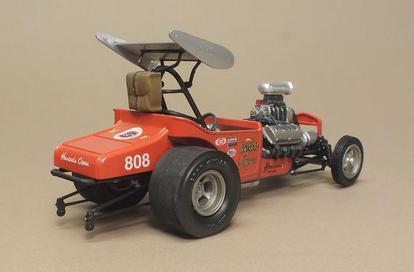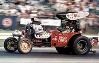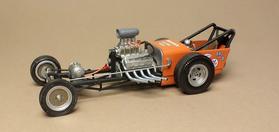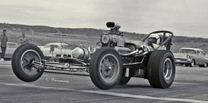 One of the more amazing classes of cars in drag racing in the 1960s were called "ALTEREDS" and were basically giant engines on short-wheelbased chassis and some form of bodywork to give some suggestion that this machine was a car. Giant slicks on the rear and crankshafts high off the ground completed the recipe. "Wild Willie" Borsch had one of the more successful altereds and he called the "Winged Express" as he pioneered the use of a large wing mounted overhead. A blown hemi provided the power of this orange ultimate altered.