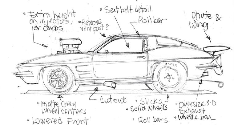 Here's a bit of fantasy...a trailer queen sort of drag car. Yes, Jungle Jim raced Vegas but the decals looked great with the Camel Yellow paint. The wire wheels look neat, too, but aren't want you need to handle the torque from that Hemi with the cross-flow manifold.
