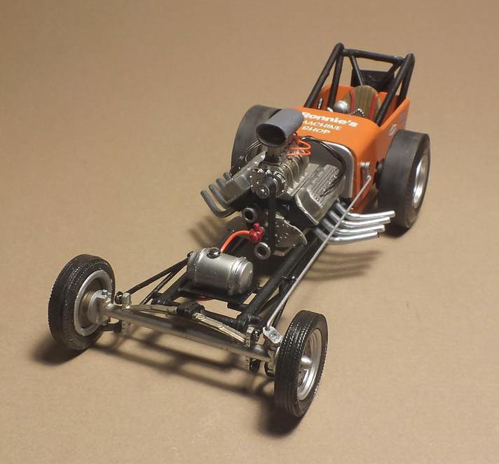The second half of the AMT Double Dragster kit was a 50s-era 'rail' dragster. In the early days of drag racing, these cars were for 'go' not 'show'...few bright parts, simple paint jobs and straightforward construction. The photo on the right has the feeling I was after. To build this model I removed the 'chrome' plating from all the parts...except the filler cap on the fuel tank. Many parts were swapped from other kits including the wheels and engine. Several parts were built from brass wire including the long steering drag link. The idea was to create a model that looks like it could have been built at Ronnie's Machine Shop whose name is painted on the cowl. 'Can't imagine sitting a matter of inches behind a blown Hemi while straddling the differential!