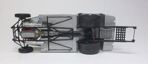 The chassis is from an '84 Camaro Pro Stock kit which was lengthened 7" scale inches. The roll cage was built from brass and styrene tubing but does not attempt to duplicate the actual car. I did include the digital "tablet" instrument panel in the model and the pro stock kit had a multilever shifter that looks great. The seatbelts are made from strips of painted masking tape. The engine has spark plug wires, fuel lines, throttle linkage and an upper radiator hose. The wheelie bars are scratchbuilt from brass tubing and wire. The 'mesh' that I assume is to pile the chutes on when driving back to the pits was made by weaving 1/16" striping tape and then painting it. The "Remove Before Flight" flags on the chutes are painted masking tape. The wing was scratchbuilt from styrene. I stripped the bright plating from the bumpers and painted them aluminum. The decals on the windows are from my leftovers box.