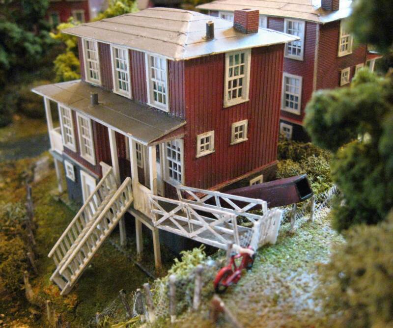 Patsy Baughman has provided many, many wonderful details about the structures of the ERC&L. One that she pointed out about the company houses is that the configuration of the railings on the porches of the houses was different, depending on where the house was. Houses in Dundon and Swandale had vertical elements in their railings, but houses in Widen had a "criss-cross" pattern, as seen in the 1957 photo above. There was an exception,however. The raised walkways into the houses on Red Row in Dundon had the cross-type only on the walkway itself, with the vertical elements on porch. Phil Bonzon has correctly reproduced the walkway railings on his models of the Red Row houses (right).